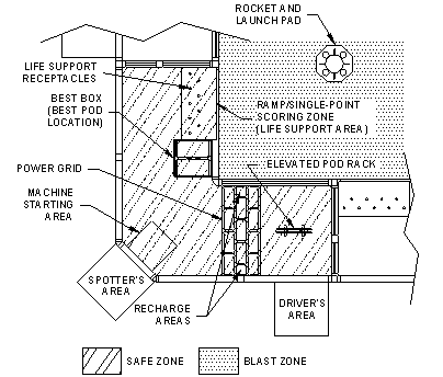 The Playing Field: The area nearest the rocket is a blast zone that will contain the heat and debris generated at launch. Each team has a safe zone, away from the rocket blast, that houses a life-support area, power grid, and pod rack. Machines can drive anywhere on the field, including other teams' safe zones.