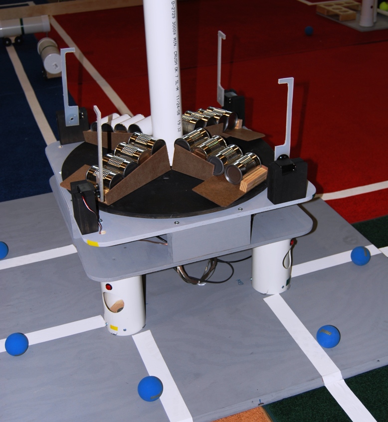 The EGS (below) includes a rotating platform that holds and dispenses energy units (small cans). Either a push-button switch or infrared (IR) sensor can be used to start the rotating platform and cause energy units to be dispensed. The IR commands, which are issued by the robots, allow multiple methods of dispensing energy. Rotation of the EGS platform also causes the CO2 molecules (blow-up globes) suspended from the overhead line to move at a rate of approximately two feet per minute. There are water molecules (racquet balls) located near the legs of the EGS.
