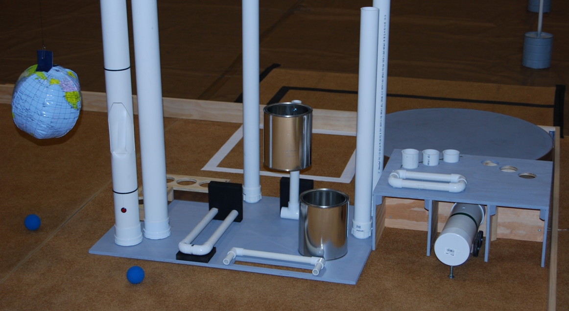 The Processing Plant (below) includes the machine starting location, the operations platform, a catalyst dispenser, and areas into which the various game elements can be placed to be used for the reactions and inventory trading. There are additional water molecules located near the Processing Plant. Catalysts (tennis balls) are distributed from the dispenser in response to either a push-button switch on the dispenser or in response to IR commands issued at the EGS. The rate in which the catalysts are dispensed depends on when the request was registered with the field, the phase of the competition, and a number of other factors.