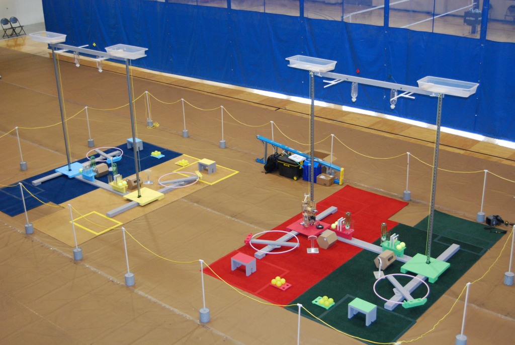 The contest is comprised of three phases: a partial round robin seeding competition, a six game round robin semi-final between the top eight teams, and a three game round robin final between the top four teams. The team’s average score during the seeding competition (with the lowest score dropped) will be used to rank the team and to determine seven of the eight teams that will advance to the semi-final round robin playoff. The eighth team for the semi-finals will be the winner of a single “wildcard” game. The participants for the wildcard game are selected based on the score of their engineering notebook.