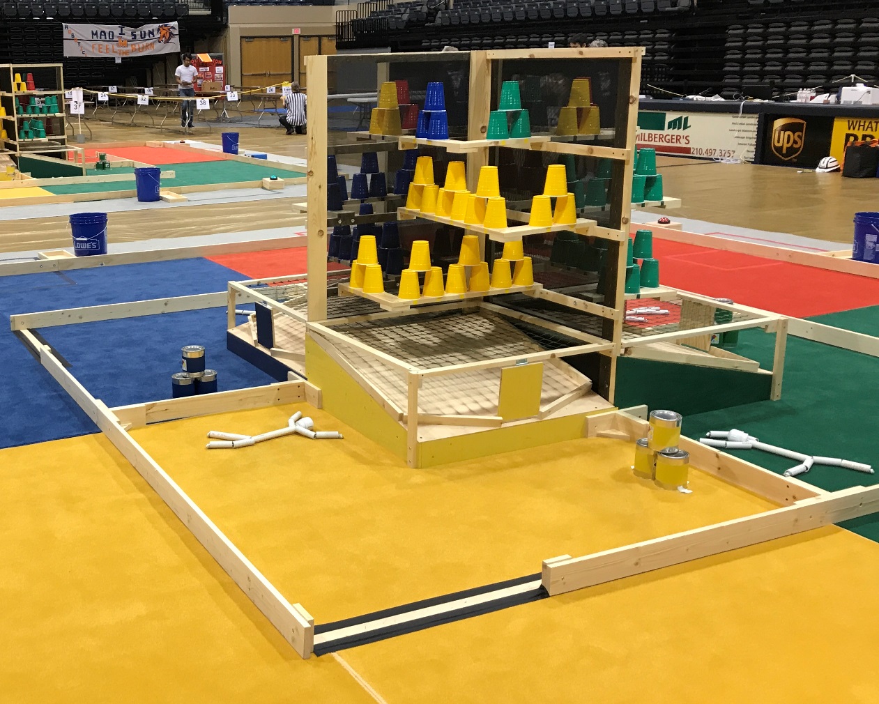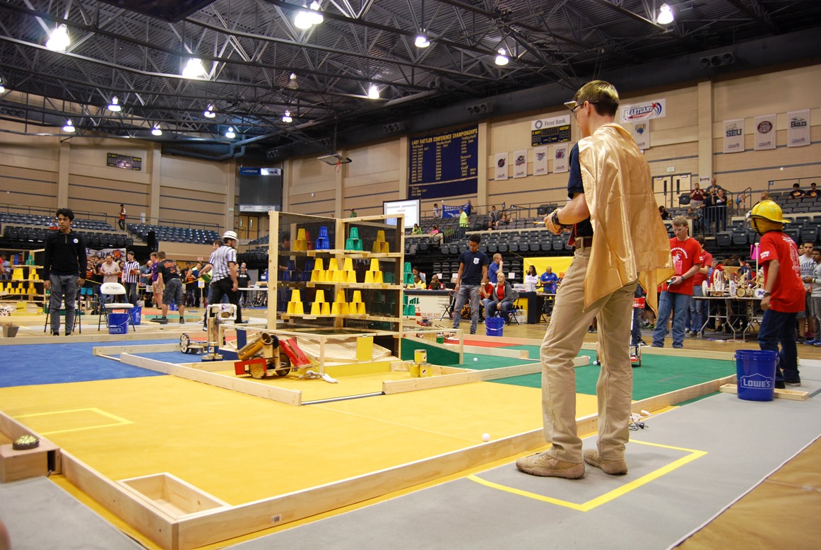 eams are tasked with rescuing the “manikin,” containing the chemical drums, and extinguishing the flames. The manikin (a PVC and rope assembly) is considered rescued when the spotter has properly placed the manikin in the stretcher located outside the field. The chemical drums (quart paint cans having various weights) are contained by having the robot place them into the containment area inside the playing field. The flames (upside down plastic cups) are considered extinguished when water (plastic golf ball) has been used to knock over the cup or to displace the cup from the shelf location.